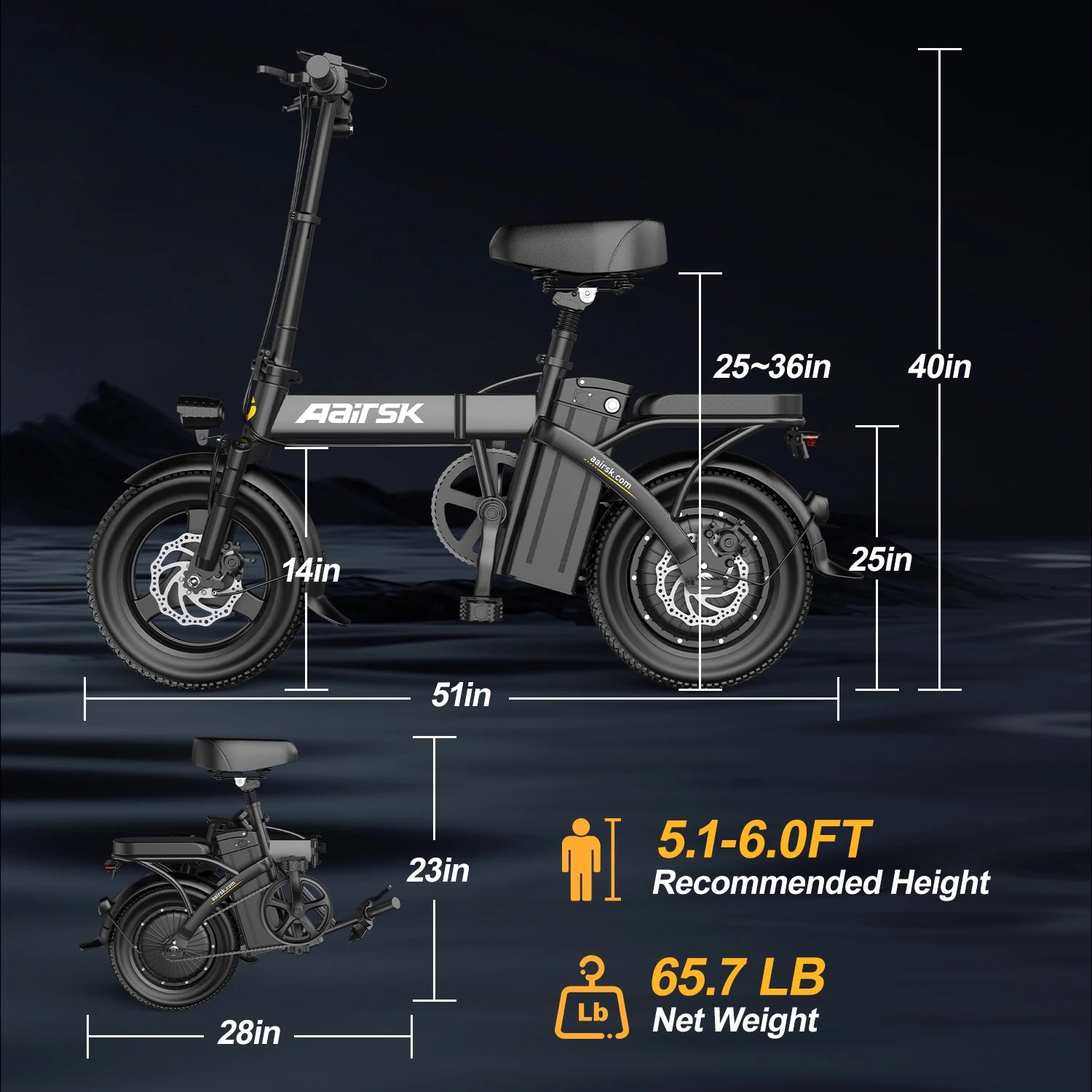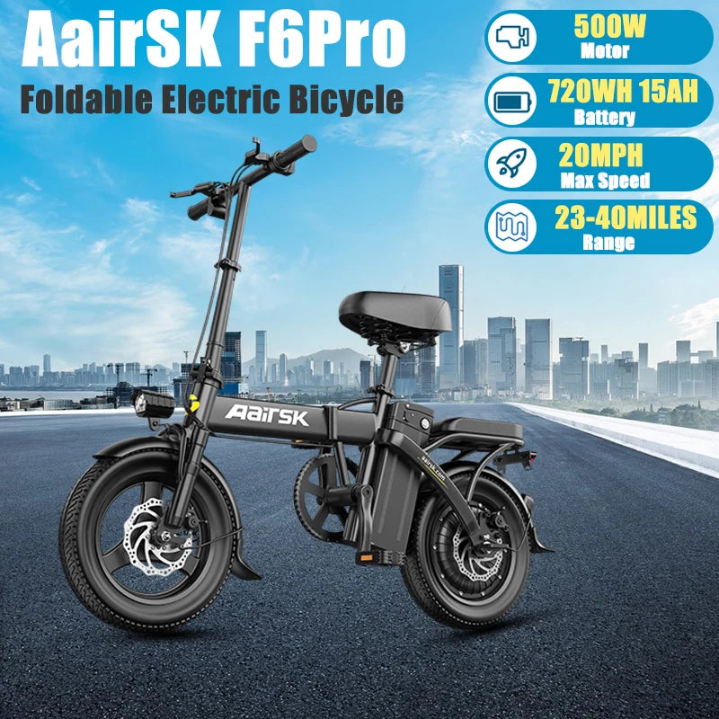 Aairsk F6Pro Electric Bicycle 500W Brushless Motor 48V 15AH Removable Battery 14"*2.15Tire Electric Bike With Bcak Seat Ebike