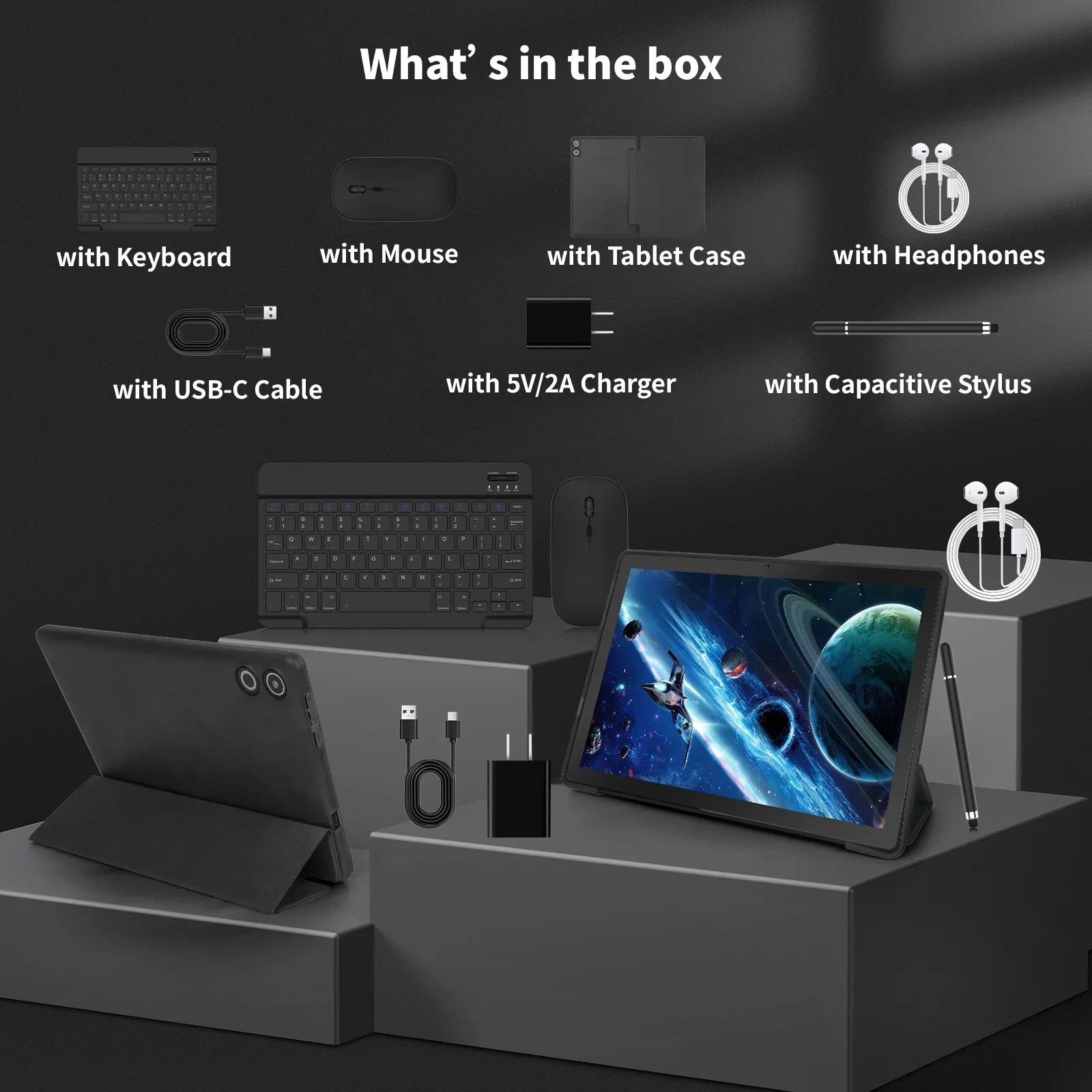 Android 14 10 inch Tablet, A523 Octa Core, 8GB RAM + 64GB ROM(TF 1TB), 5000mAh, Face Unlocked,Black+Keyboard & Mouse Set, Black