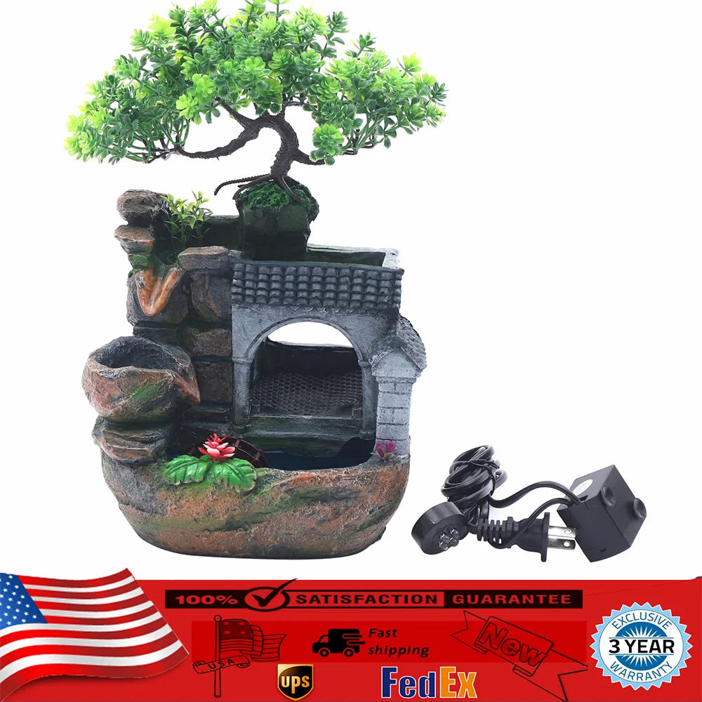 Desktop Fountain Rock Waterfall Humidifier with Artificial Tree &LED Light Feng Shui Decoration for Aquariums Office Décor