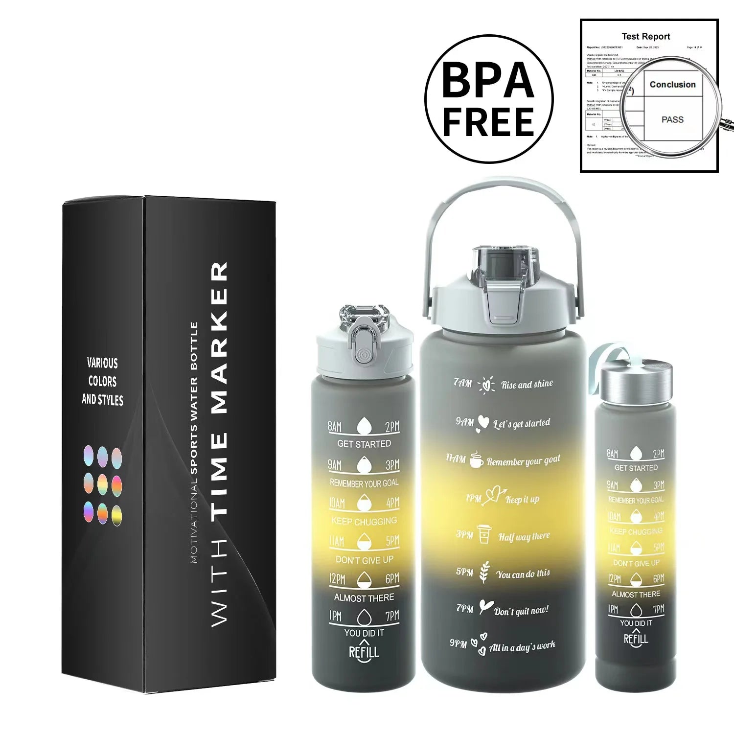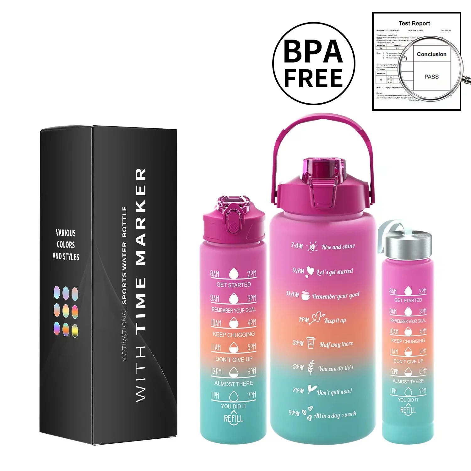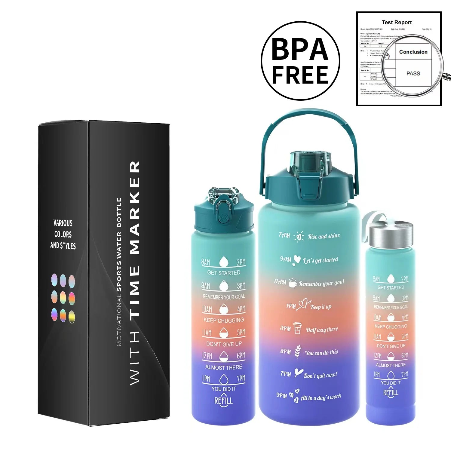 Multi-Color 3-Piece Water Bottle Set, Leak Proof Gradient Sports Bottle, Portable PC Drink Container With Time Stamp And Straw F