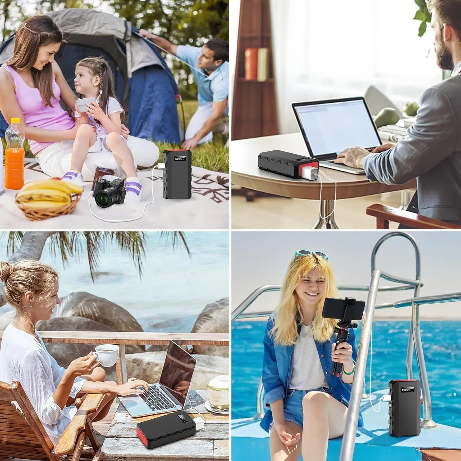 Our product includes QC3.0 9v/2A and 5V/3A two USB outputs, one 110V AC outlet, one DC 9~12.6V/10A (Max) output, which means this charger can power your multiple devices at once.