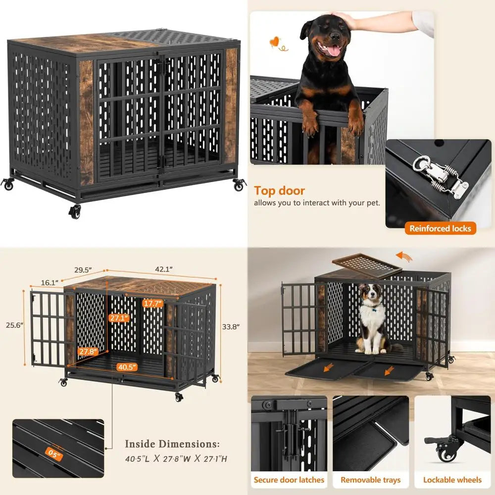 This product features a dog crate with internal dimensions of 40.5 inches in length, 27.8 inches in width, and 27.1 inches in height. To ensure a proper fit for your pet, measure your pet and compare it to these dimensions. The kennel is made from heavy-duty, corrosion-resistant steel, with the front door panel reinforced with 0.8-inch square tubing for added durability. The crate is designed for easy use and maintenance, with two removable trays for waste disposal and four lockable 360-degree wheels that allow for easy movement and stability. It also includes a top door for convenient access to check on or feed your pet, and a wide-slatted bottom to prevent discomfort to your pet's paws. The crate is equipped with four escape-proof locks to keep your pets secure.