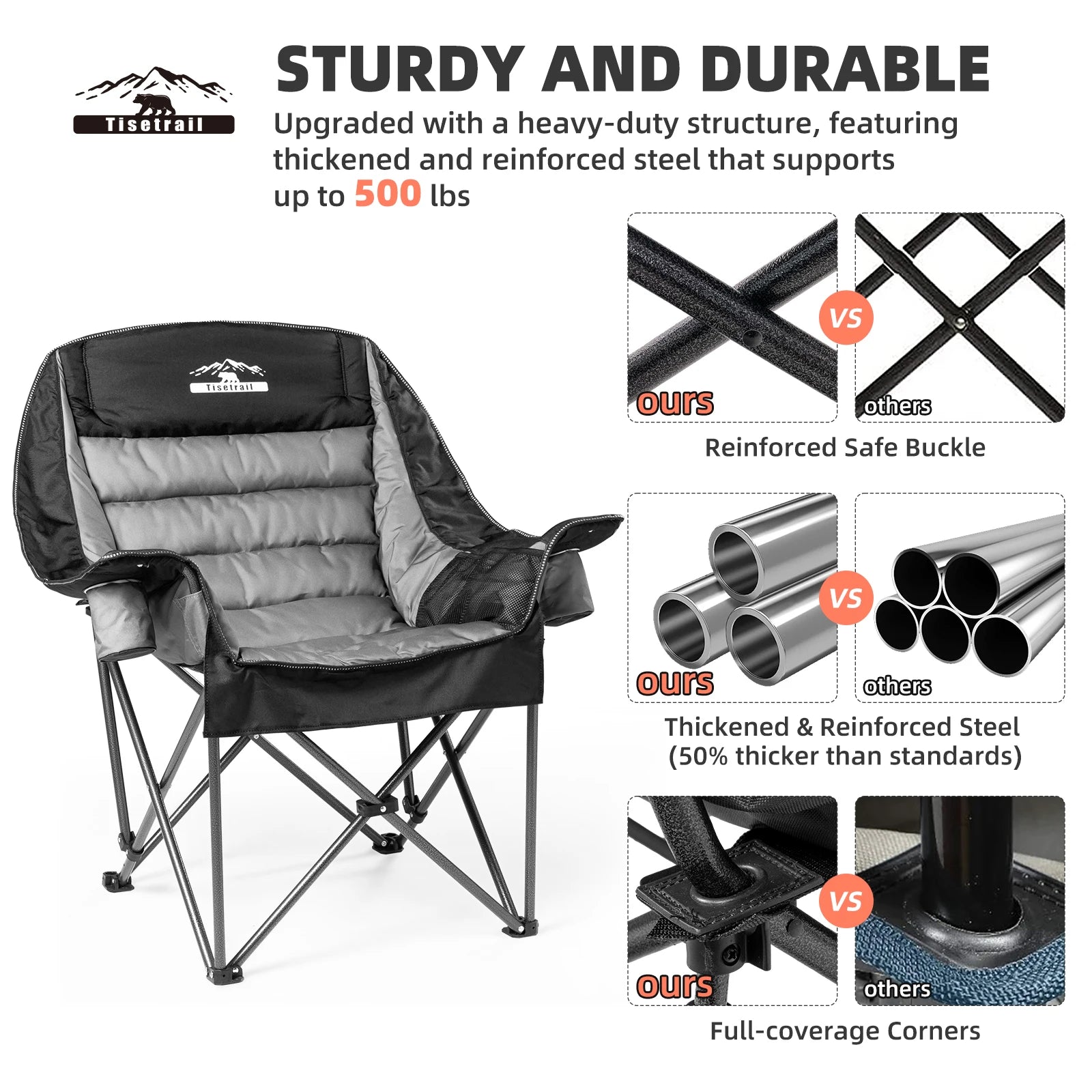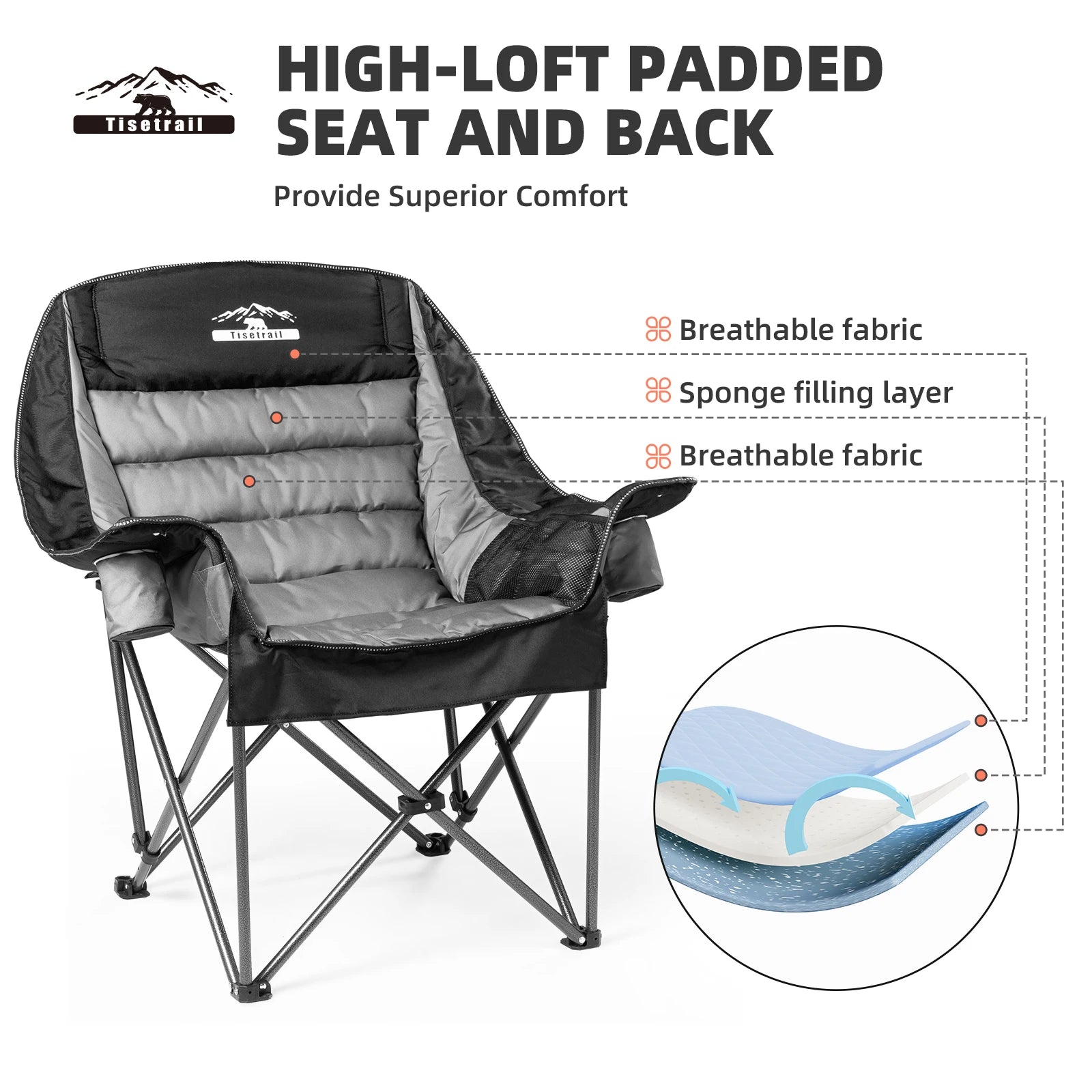 Tisetrail Oversized Padded Camping Chair Extra Large Camp Chairs for Adults with Side Pocket and Cup Holder Black and Gray